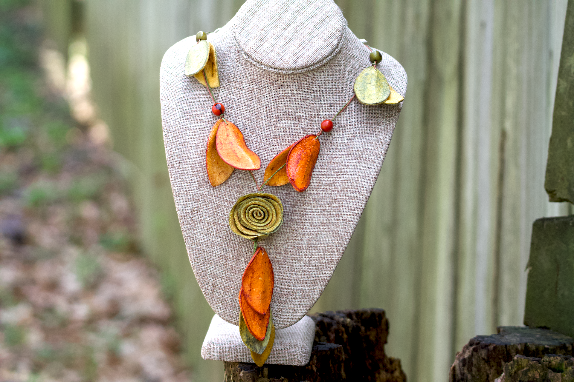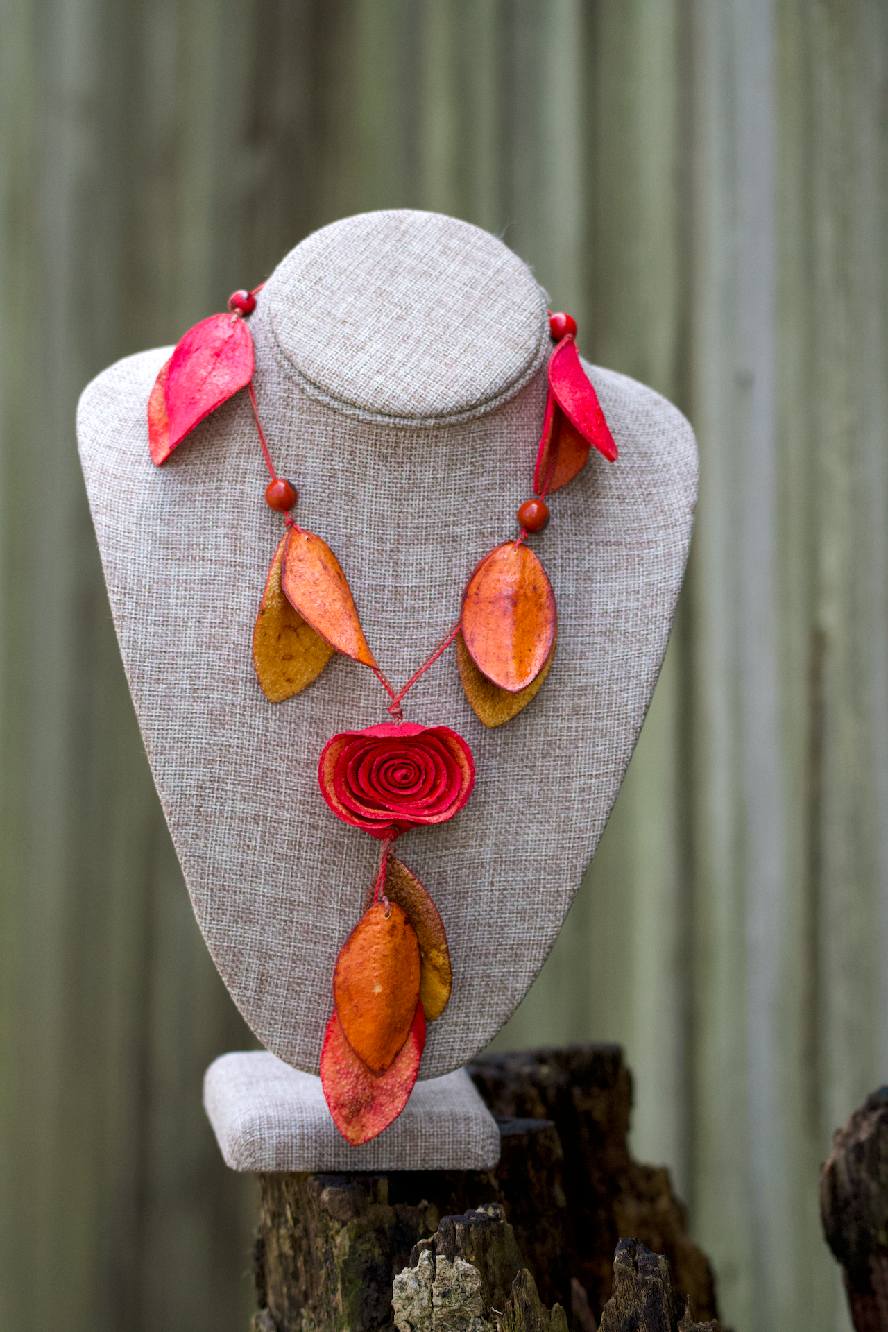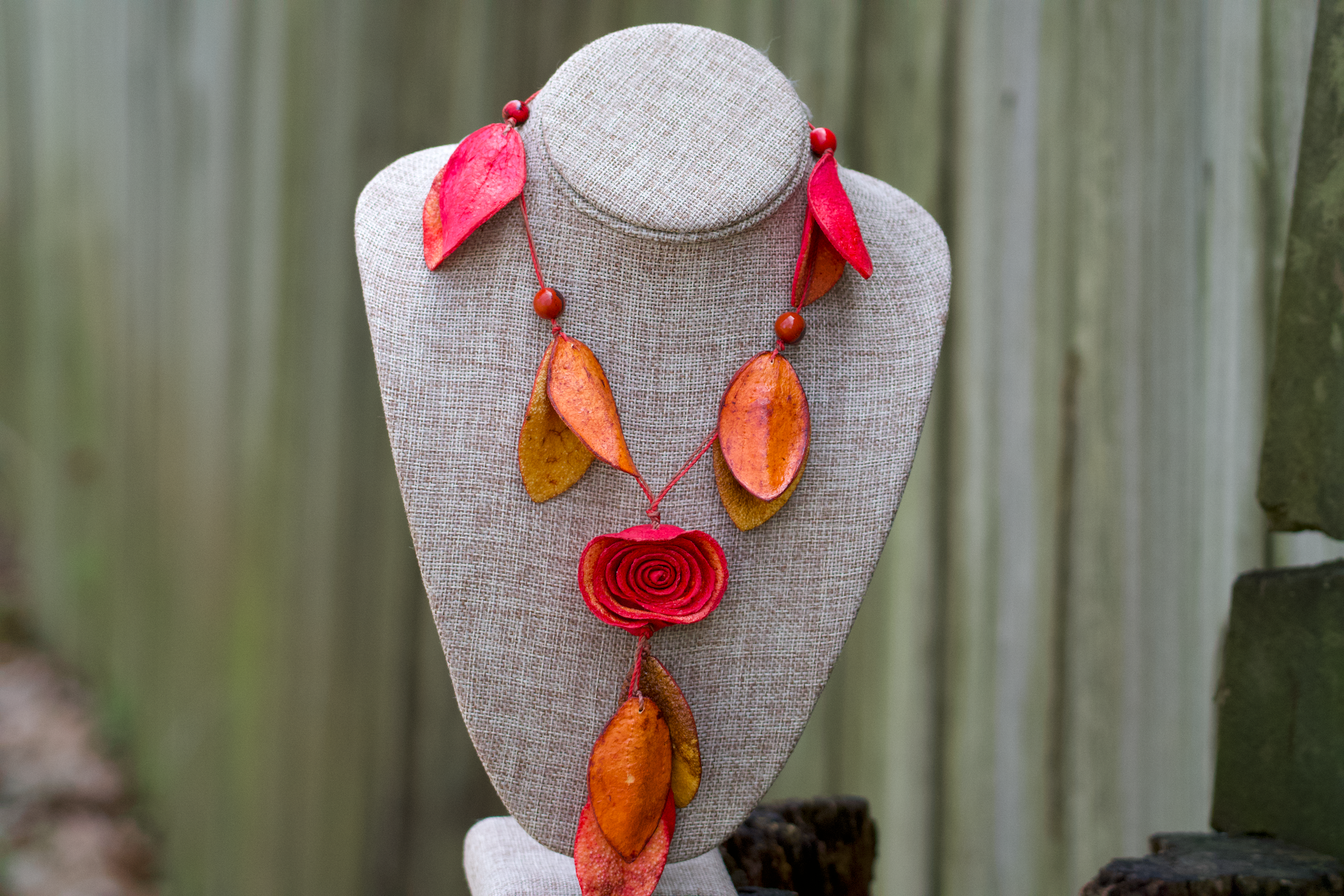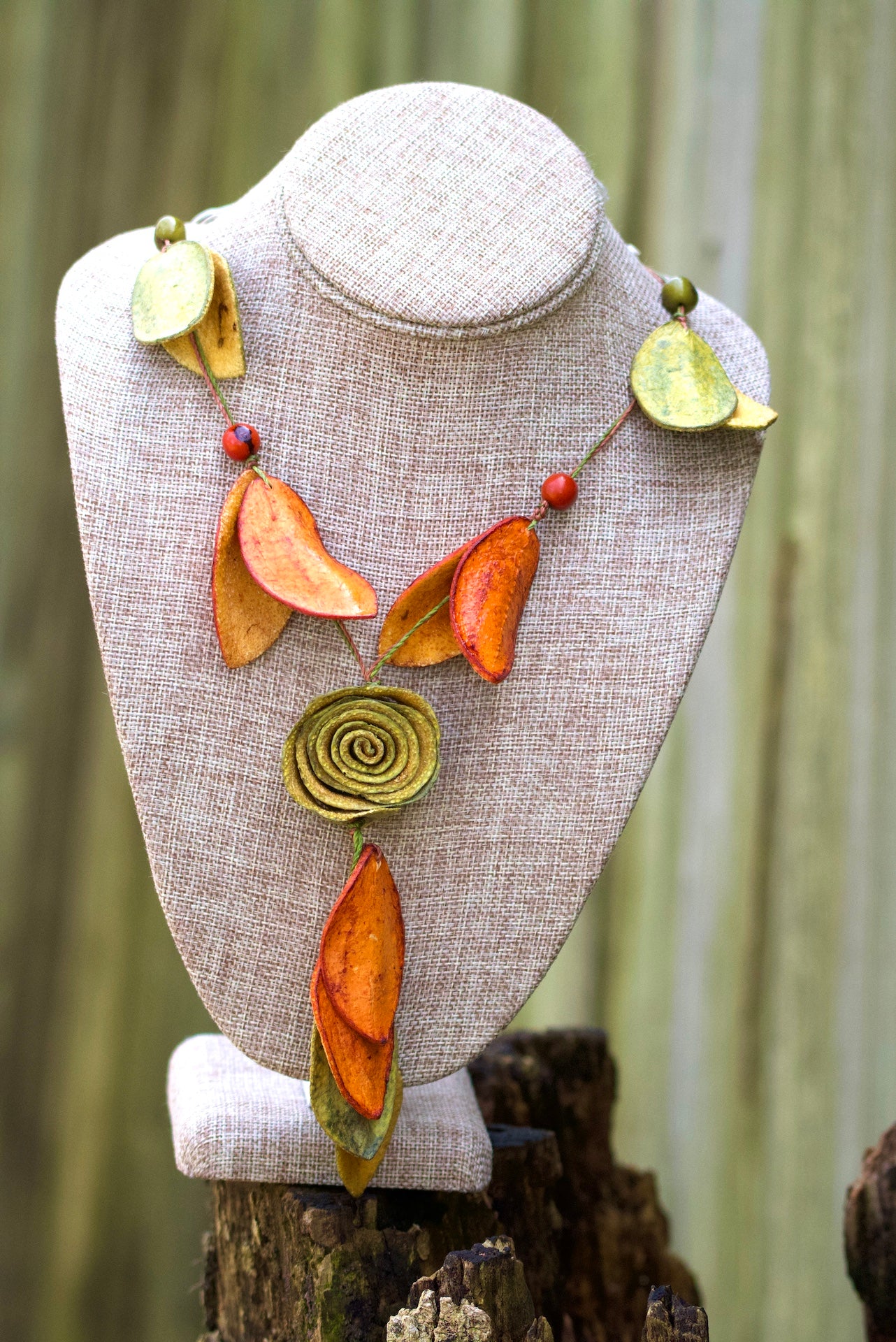 Experience the artistry of upcycling with these unique necklace handcrafted from carefully shaped and dehydrated orange peels, transformed into elegant leaf shapes.