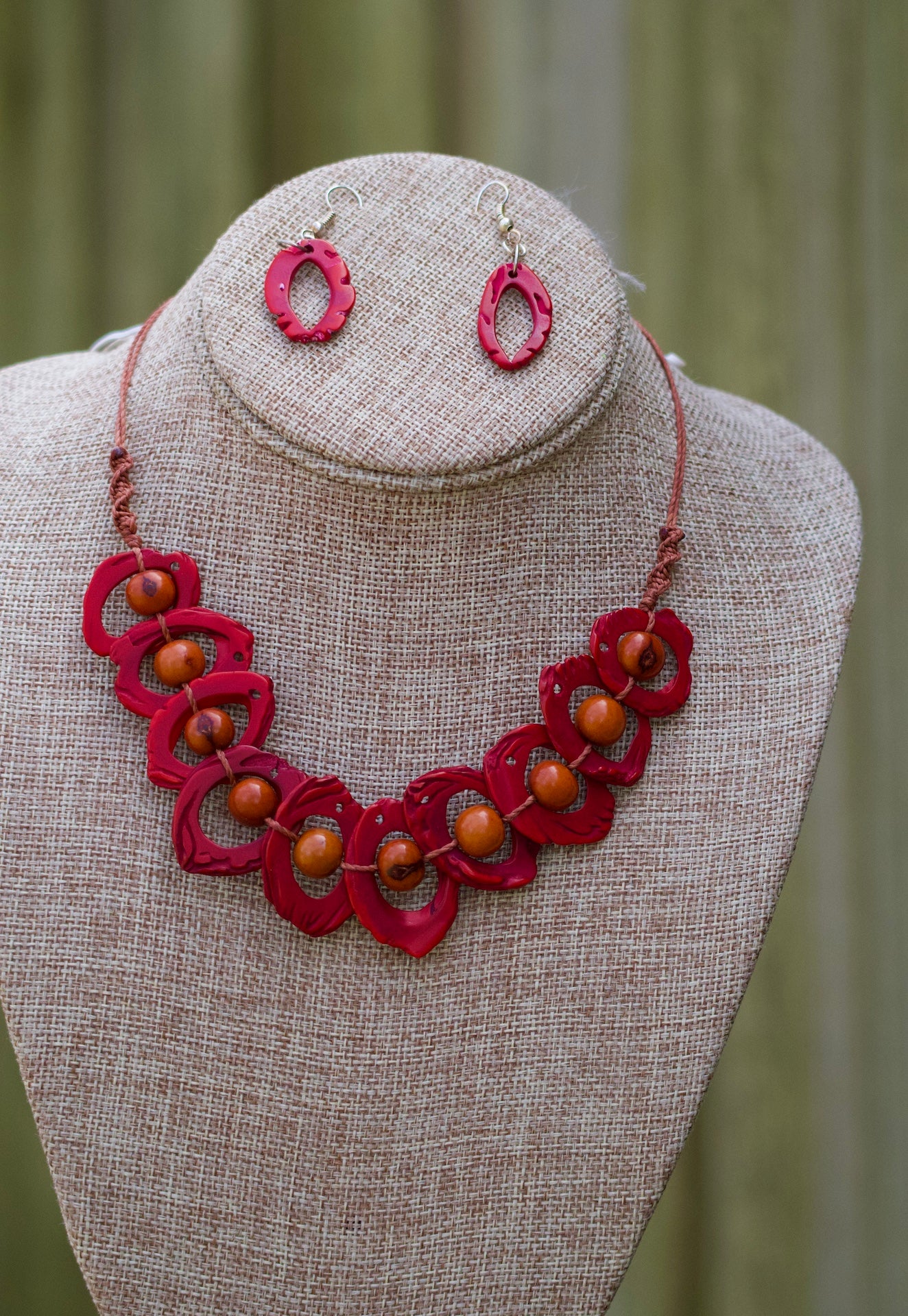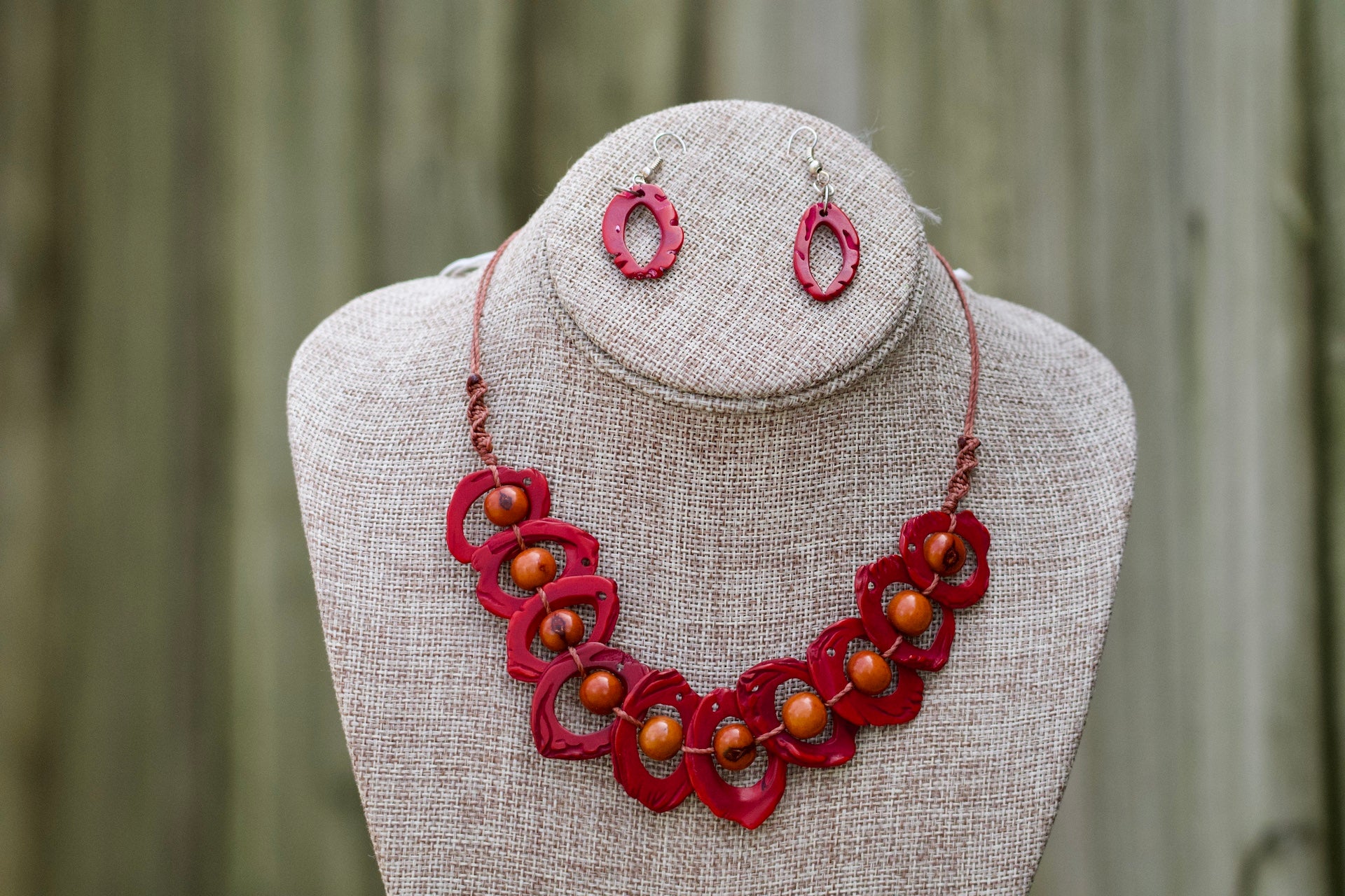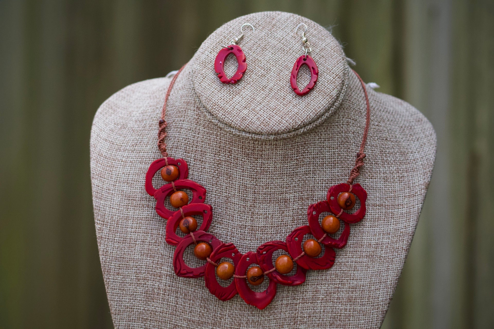Exquisite necklace meticulously handcrafted using peach pits that are delicately carved and dyed through a meticulous process of hard boiling.