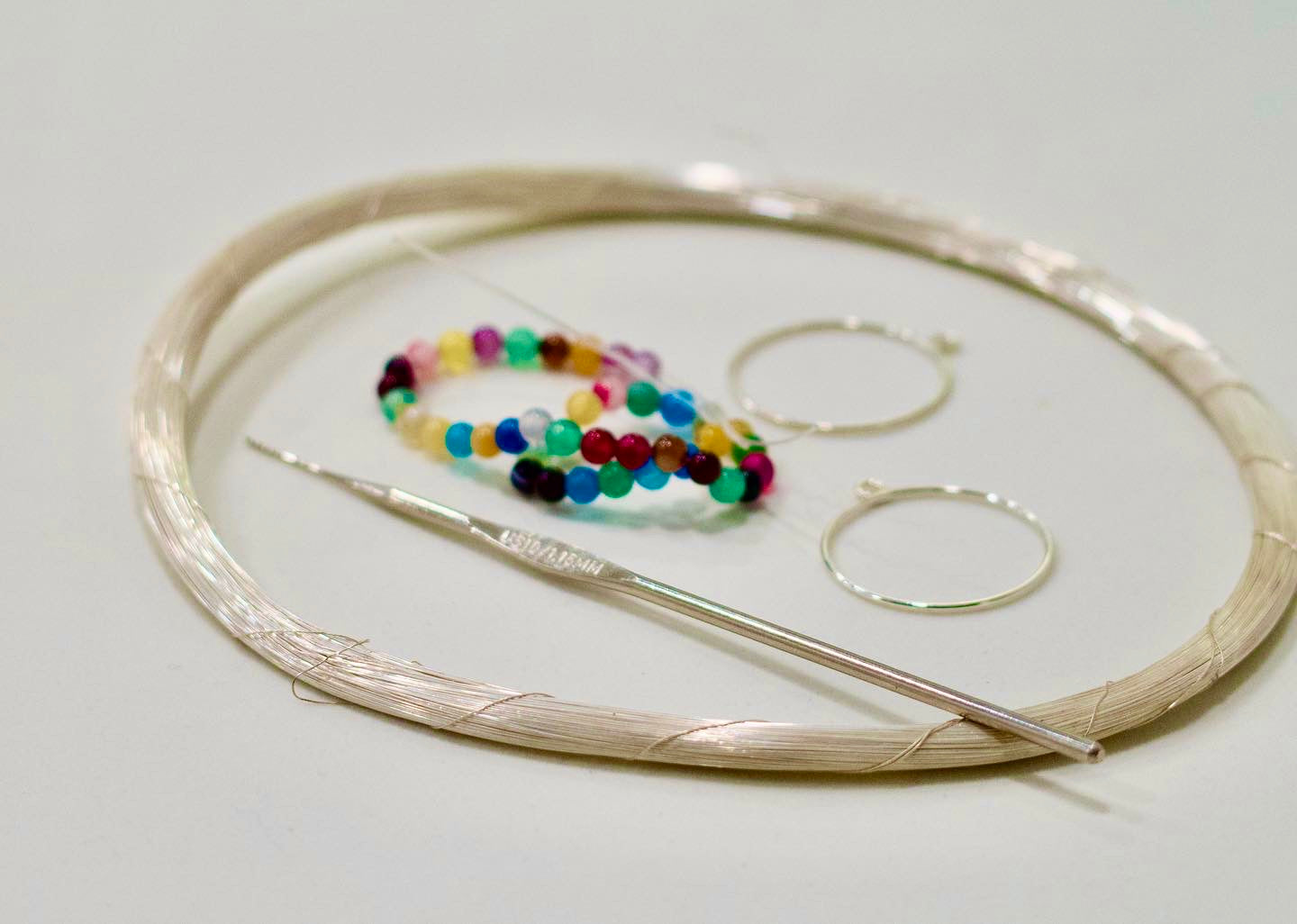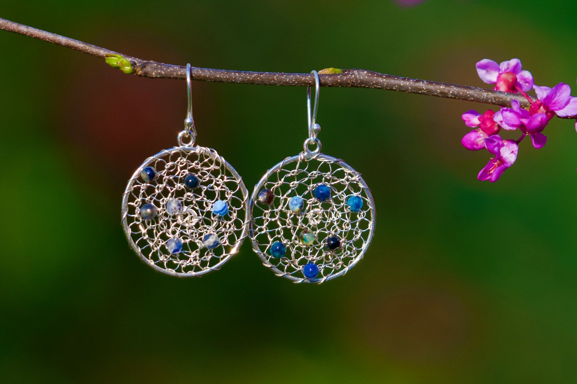 These are one of a kind piece of earring delicately crocheted with sterling silver wire with some blue stones.